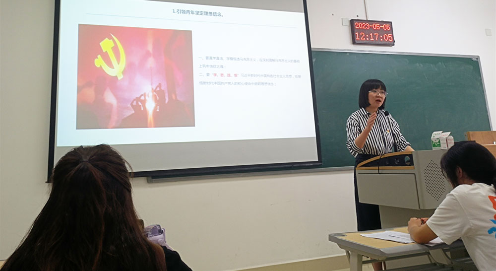 本科生第三党支部书记贺春湘老师在7B305教室为支部全体成员讲授“三个务必之于新时代青年思想政治教育”专题党课。