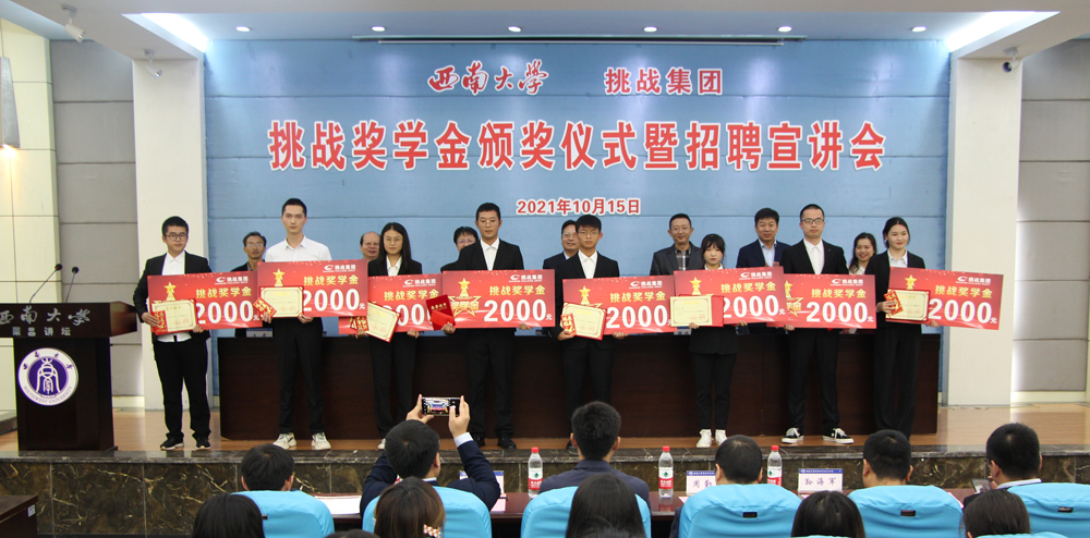 10月15日, 2020-2021年度挑战奖学金颁奖仪式暨招聘宣讲会在荣昌校区2211报告厅隆重举行。挑战集团创始人蔡辉益、大客户事业部总经理刘家、人力资源招聘培养项目总监李小君等出席,动漫屋