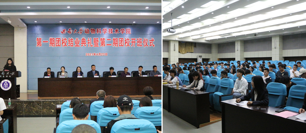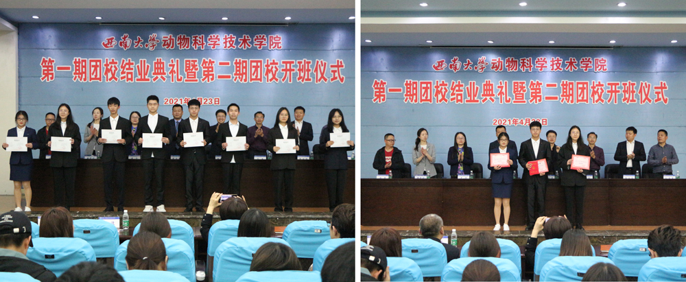 团委关于表彰第一期团校优秀学员的通知》,主席台就座的领导嘉宾为第一期团校学员代表颁发了团校结业证书、为优秀学员代表颁发了荣誉证书。第一期团校优秀学员代表,2020级动物生产2班张瑶同学发言,表示通过第一期团校的系统学习,同学们不仅提升了理论水平,培养了大局观念,提升了自我综合素质,还结识了更多优秀的同学;她号召同学们将从团校学习的知识运用到学习实践中,不断提升自己,为以后投身祖国建设打下坚实基础。第二期团校学员代表,2020级动物生产5班余梓涵同学发言,表示将珍惜团校学习机会,以最饱满的热情、最实际的行动投入到团课学习当中。