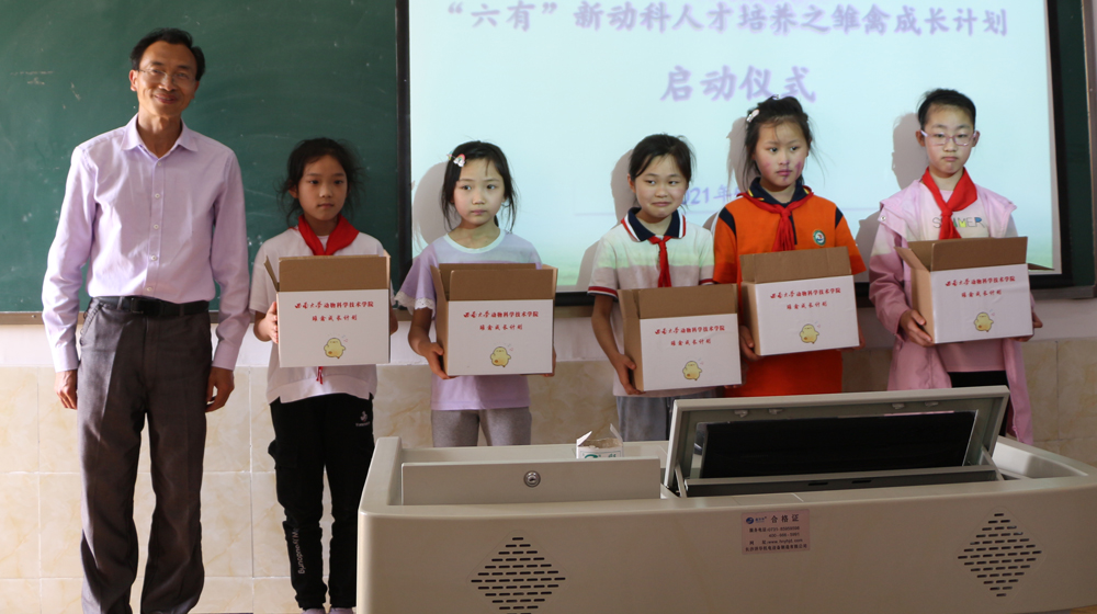 团委书记、学生工作办公室主任孙海军、辅导员彭香与党支部其他学生志愿者为小学生分发了鸡苗、饲料、饲养手册和学习用品。