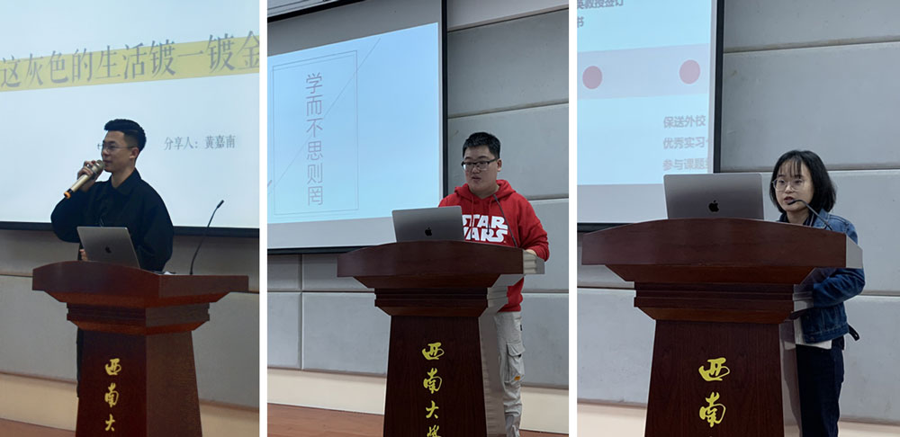 2017级动物科学专业的周月玲为大家做了题为“来着之可追”的分享,她从“学在西大”和“玩在西大”两个方面向大家讲述了自己的学习和生活经历,并用科学统计的方法与大家探讨了学业成绩的影响因素。