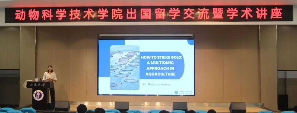 在荣昌校区2211报告厅举办出国留学交流暨学术讲座,邀请澳大利亚詹姆斯∙库克大学的Roberta Marcoli博士开展题为How to strike gold: a multiomic approach in aquaculture专题讲座。