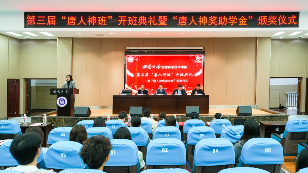 孙海军宣读第三届“唐人神班”学员名单,第三届“唐人神班”学员代表常真珍在发言中表示要传承和发扬“敬业、自责、自信、创新”的唐人神精神,坚定爱农、知农、学农的信心和决心,不断成长为“六有”现代畜牧科技人才。随后,刘金伟宣读“2023-2024学年唐人神奖助学金”获奖名单,主席台就座的嘉宾、领导为获奖学生颁发获奖证书。“唐人神”奖助学金获奖代表杨智代表全体获奖同学郑重承诺,将珍惜这份荣誉,以实际行动回报唐人神集团与动漫屋