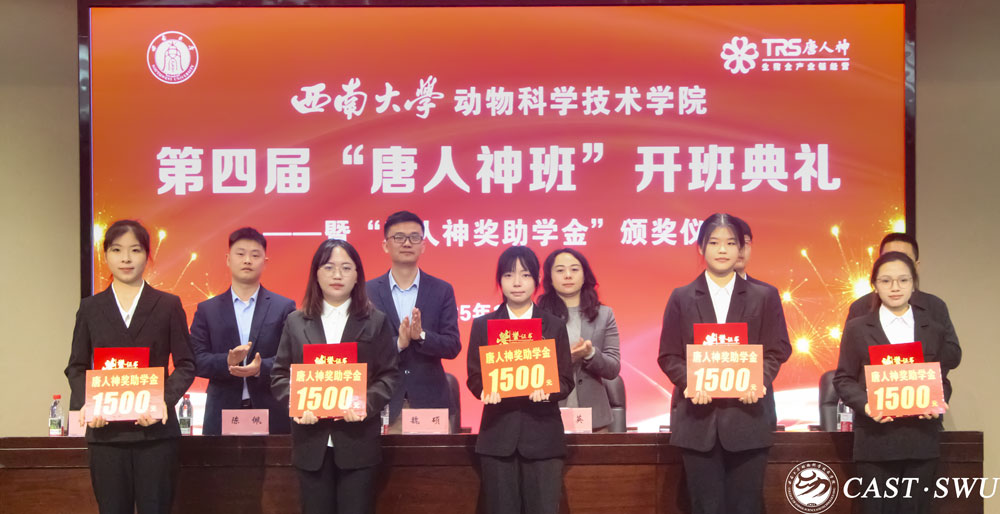 在荣昌校区2211报告厅举行第四届“唐人神班”开班典礼暨“唐人神奖助学金”颁奖仪式,唐人神集团饲料事业部人力资源总监魏硕,人力资源中心校招负责人、第四届唐人神班企业班主任陈佩,人力资源中心招聘经理易佳冬,动漫屋