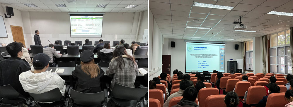 的相关情况。随后,夏耀耀、牟道临和郭娜分别以“Chronobiology in infection and immunity: focusing on melatonergic signaling and macrophage”“母猪妊娠期饲粮中添加硒蛋氨酸羟基类似物对繁殖性能的影响及机制研究”和“放牧牦牛食性选择的季节变化及其与肠道微生物的互作研究”为题做了专题报告,并与在场师生进行了热烈的讨论。