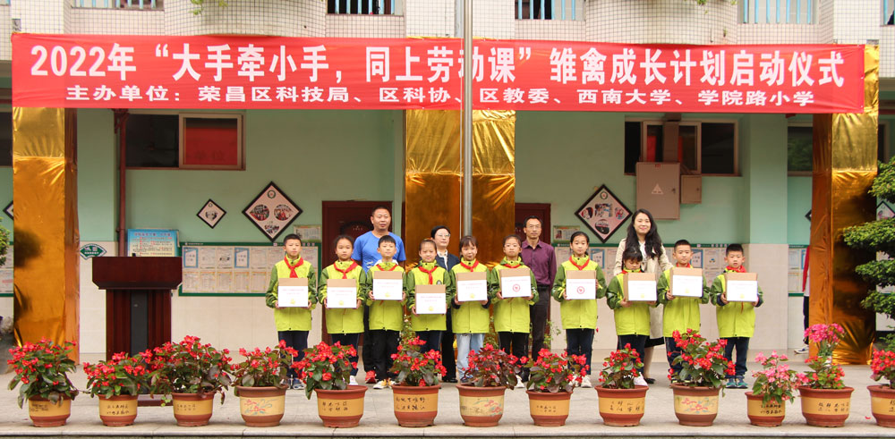 路小学陈明军校长授牌,由文武、游洁、刘振玲、陈明军为小学生代表发放鸡苗。最后,文武发言指出,“大手牵小手 同上劳动课”雏禽成长计划,是大学生、小学生共同参加劳动的一种创新劳动形式;希望在活动过程中,大朋友、小朋友手要牵更紧,经常沟通交流劳动中的科学知识,共同用劳动和创造播种希望、收获果实,磨炼意志、成长自己。