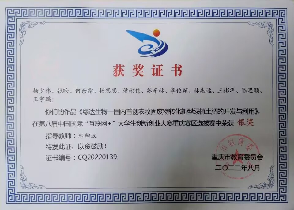龙昊源等学生在俄广鑫教授指导下完成的《检测速度快、质优价低的猪分子育种 SNP 基因型检测解决方案》,杨少伟等学生在朱曲波副教授指导下完成的《绿达生物——国内首创利用农牧固废物转化新型绿植土肥的开发与利用》分别获得重庆市金奖、银奖。
