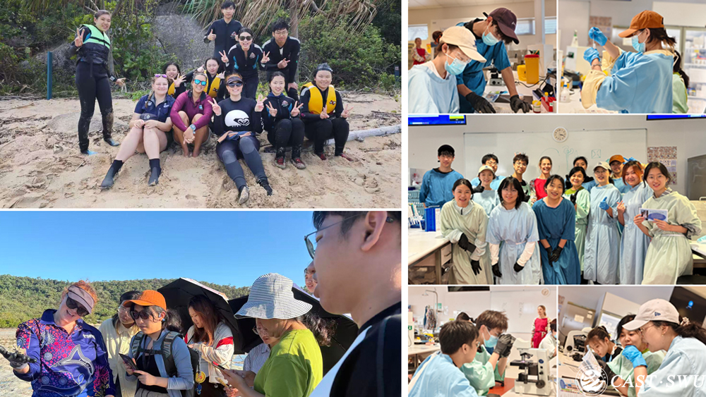 本次赴澳交流学习主要围绕学术交流与文化体验两大主题展开。学术交流方面,访学团深度参与了《寄生虫学》《动物疾病检测及诊断》等JCU特色课程。通过案例研讨、随堂研习、专题研讨、实验室观摩等实践环节,学生们亲身体验了JCU“问题导向+情境互动”的创新教学模式。在国际学术论坛环节,学生们参与了国际留学生主讲的学术报告会,深入了解其在海洋科学等领域的科研进展与海外求学体验。最具特色的是访学团前往JCU研究中心——奥菲斯岛研究站(Orpheus Research Island)开展沉浸式研学,在JCU科研人员指导下,学生们通过浮潜观测珊瑚、鳐鱼、鲸鱼、鲨鱼等海洋生物,深化对JCU优势学科海洋生物学这一领域的认识。文化体验方面,访问团亦利用课余时间踏足于Magnetic Island等多个国家公园,与袋鼠、考拉等澳洲特有动物亲密互动,实地考察热带雨林生态系统,全面感受了澳大利亚的自然环境与人文风貌。